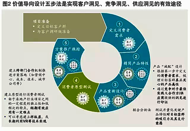 我們提出價(jià)值導(dǎo)向設(shè)計(jì)五步法,將之應(yīng)用于房地產(chǎn)企業(yè),并融合消費(fèi)者、供應(yīng)商和競爭洞見,圍繞目標(biāo)客群以實(shí)現(xiàn)客戶感知價(jià)值提升和股東價(jià)值創(chuàng)造(見圖2)。